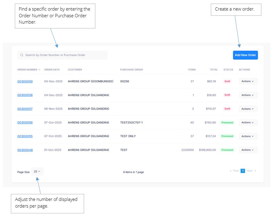 - Actions: Users have the option to view or edit their order details by selecting the Actions dropdown menu and choosing either View Order or Edit Order. Users can also access this functionality by clicking on the Order Number as well.