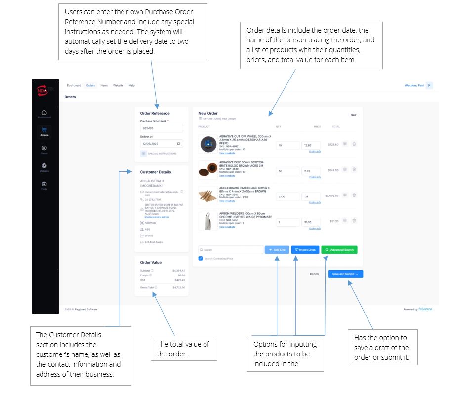The email includes a full summary of the order, such as the items ordered and their quantities, pricing, and any other details. The order is then logged into the NDA system for processing and fulfilment.