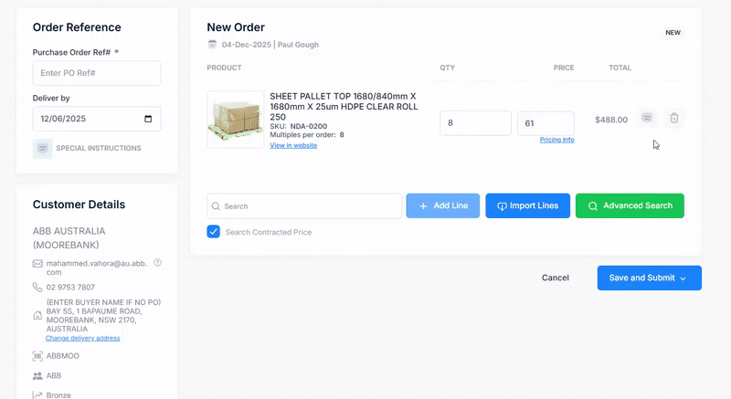 Once you select a product, the + Add Line button will activate. Click it to add the product to your order.
