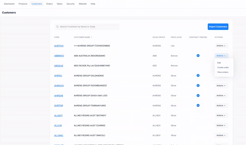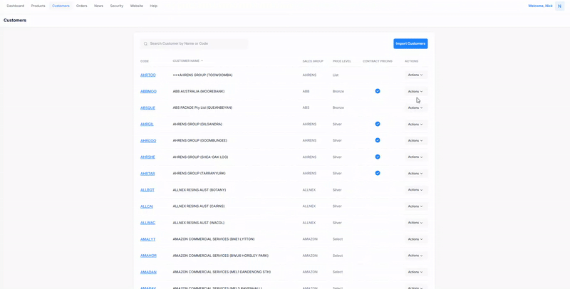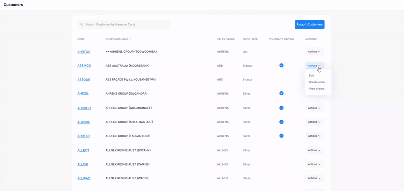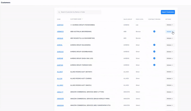 - Edit: Opens the customer’s contract pricing page, allowing for adjustments to their pricing details (this works the same way as clicking on the Customer Code).