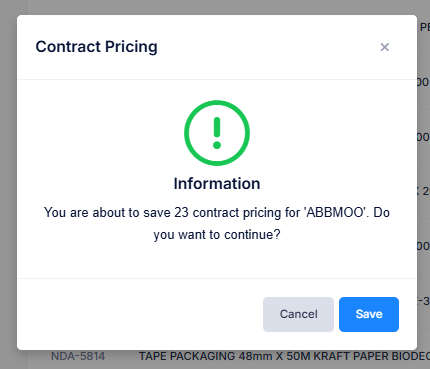 When you add or update pricing, a confirmation prompt will appear before saving. This helps ensure you’ve entered the correct pricing details. Once you click Save, the updated contract pricing will be applied in the system.