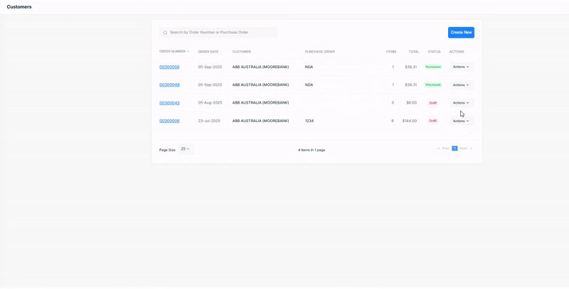 You also have access to view all the orders placed by the Customer. Clicking on the Actions drop down menu of a particular order lets you view the full details of the order, where you can also archive or edit the order.