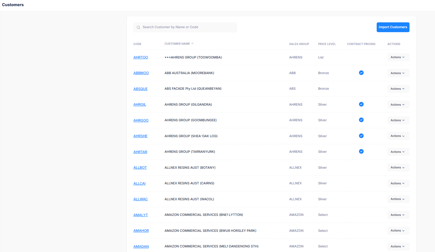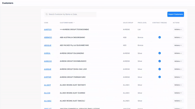 - Code: This is a unique identifier assigned to each customer. Clicking the code opens the Customer’s detailed profile page, where you can view and edit their contract pricing settings.